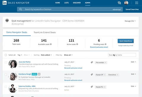- In Sales Navigator, hover over Admin at the top of the page and select Seat Management from the dropdown menu.